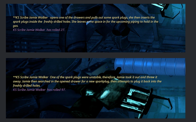 Approved While you hit all the key marks, I find the order in which you did it in weird though, wouldn't you blueprint first and THEN gather materials? How do you know what to gather if you don't have a blueprint made first? Remember if you fail a roll, you MUST re-roll to try and succeed it. You did it a few times once again where you did a failed roll, and then just moved on from it by doing a /me without a roll. Future projects will be put on hold if this occurs again. /me "searches for a key" /roll (rolls a 2, failing the action) /me "I didn't find a key initially, but I searched and found one now!" (no roll) That defeats the purpose of getting bad results on a roll.